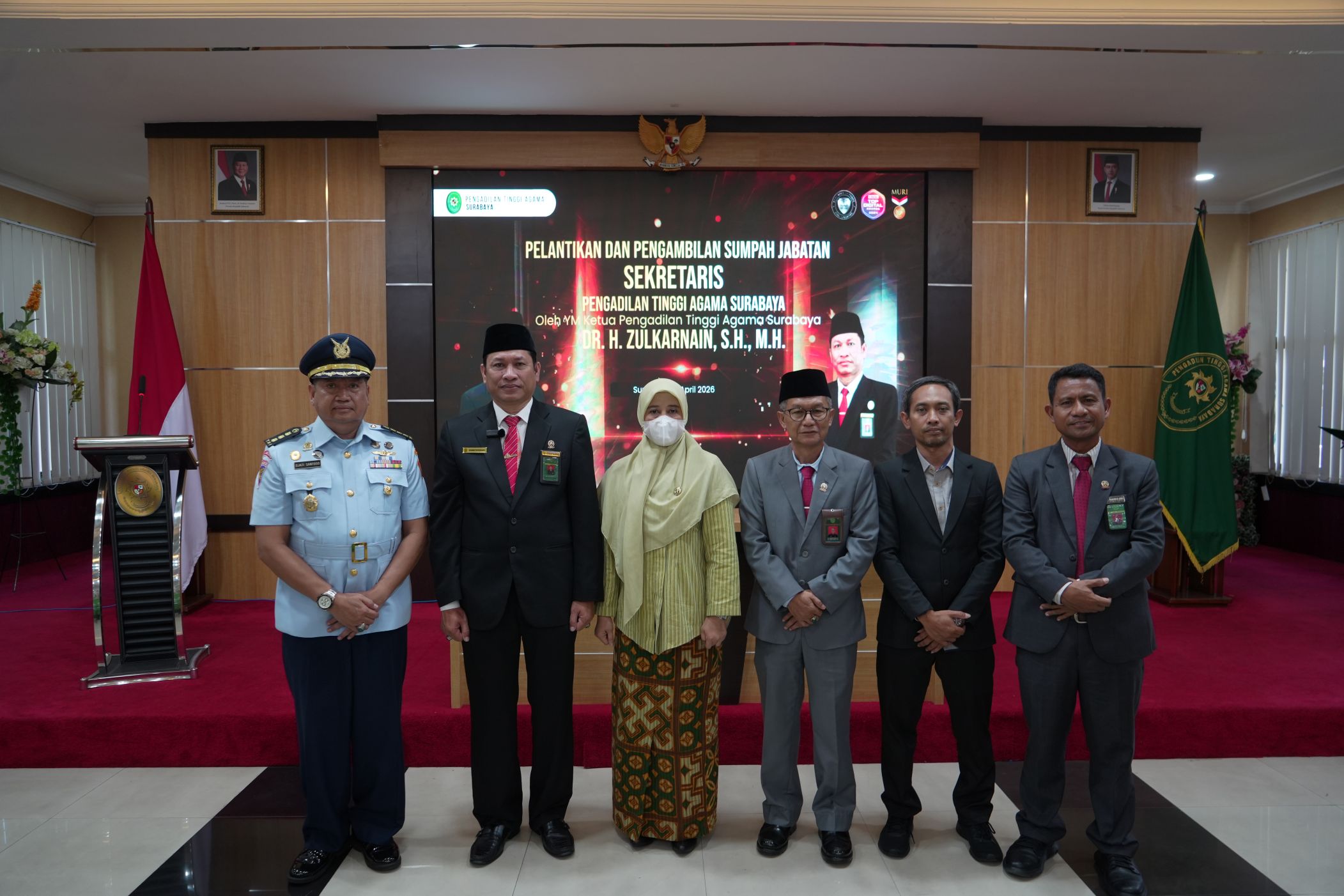Rabu, 15 April 2026. Pimpinan Pengadilan Agama Ponorogo turut menghadiri kegiatan pelantikan dan pengambilan sumpah jabatan Sekretaris Pengadilan Tinggi Agama (PTA) Surabaya yang diselenggarakan pada Selasa, 14 April 2026. Kegiatan tersebut berlangsung di Aula PTA Surabaya dengan dihadiri oleh jajaran pimpinan serta perwakilan satuan kerja Pengadilan Agama se-Jawa Timur. Kehadiran pimpinan PA Ponorogo merupakan bentuk dukungan terhadap keberlangsungan roda organisasi di lingkungan peradilan agama tingkat banding. Selain itu, momen ini juga menjadi ajang mempererat koordinasi antar satuan kerja di bawah PTA Surabaya.